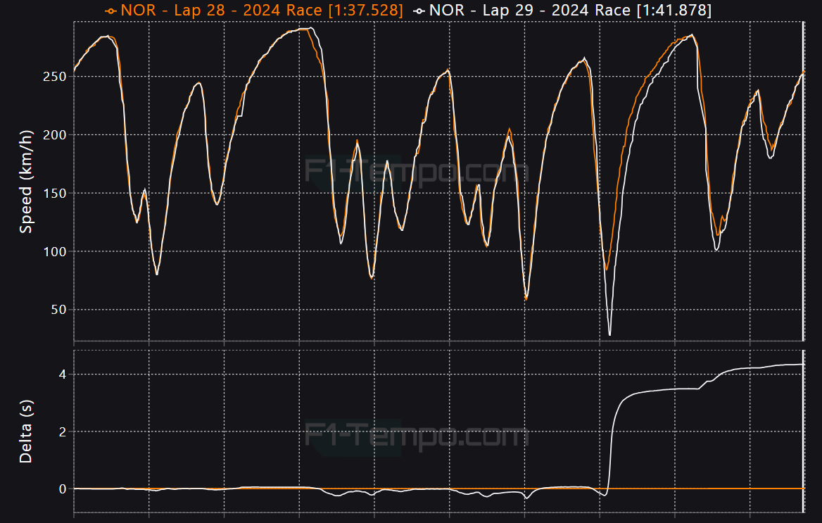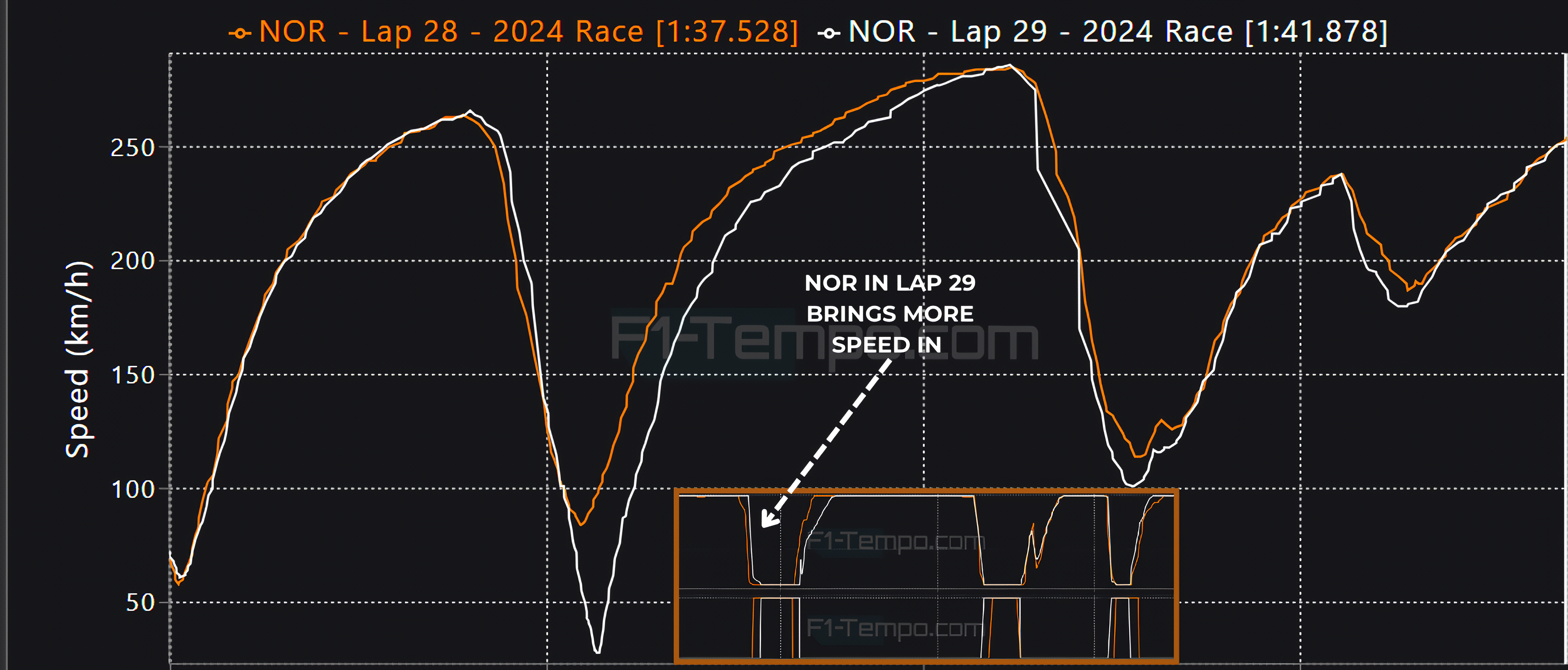 Using the telemetry provided by f1-tempo.com we can see how in lap 29 Lando Norris tries to optimize his lap, the first point where we can notice it is in turn 7, where he delays the step up of the foot from the accelerator, but brakes in a similar way to the previous one, obtaining an advantage of about 0.25s compared to the 28th lap.