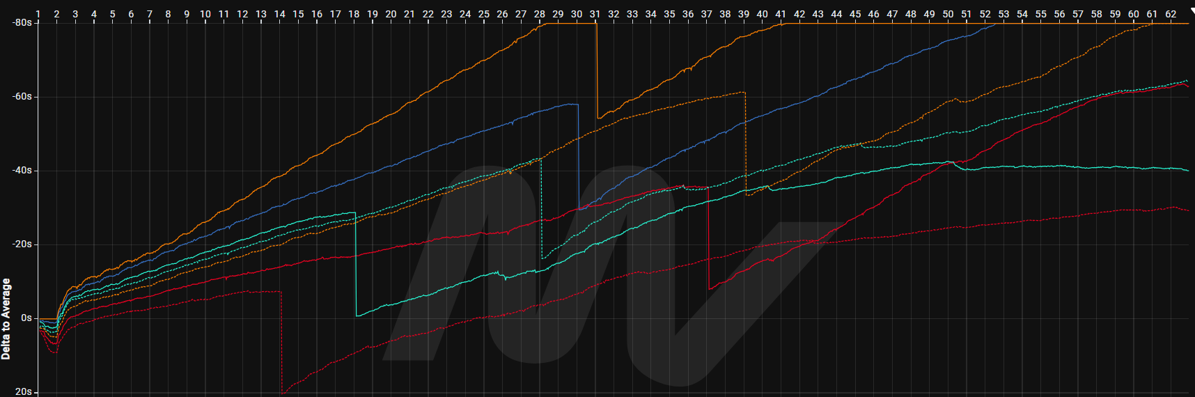 One thing we can notice immediately, is that unlike the previous races there are no similar steps, for example Piastri loses 0.33 s/ lap compared to the Dutch, and in turn Leclerc loses 0.32 compared to the Australian.