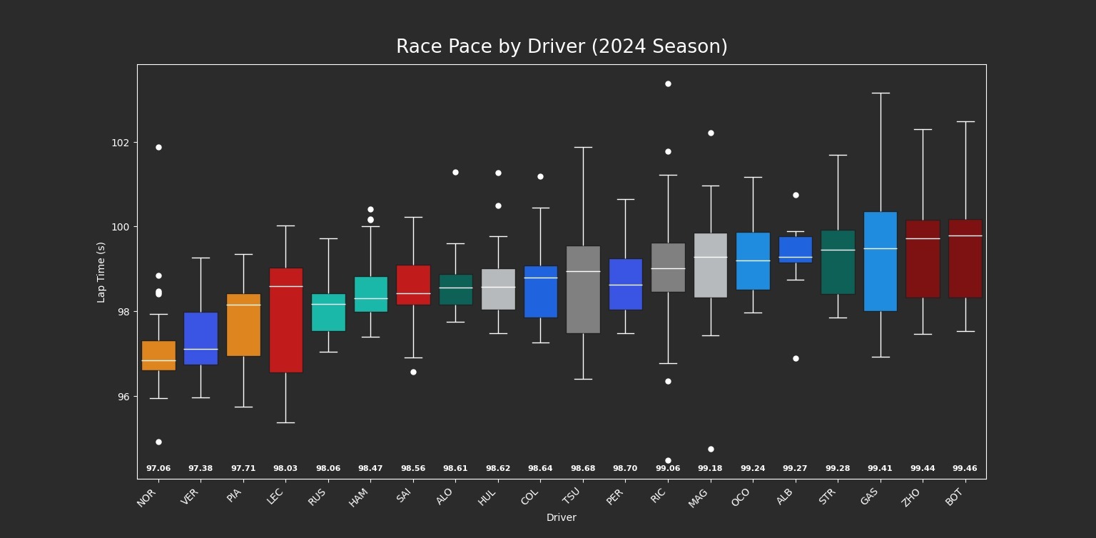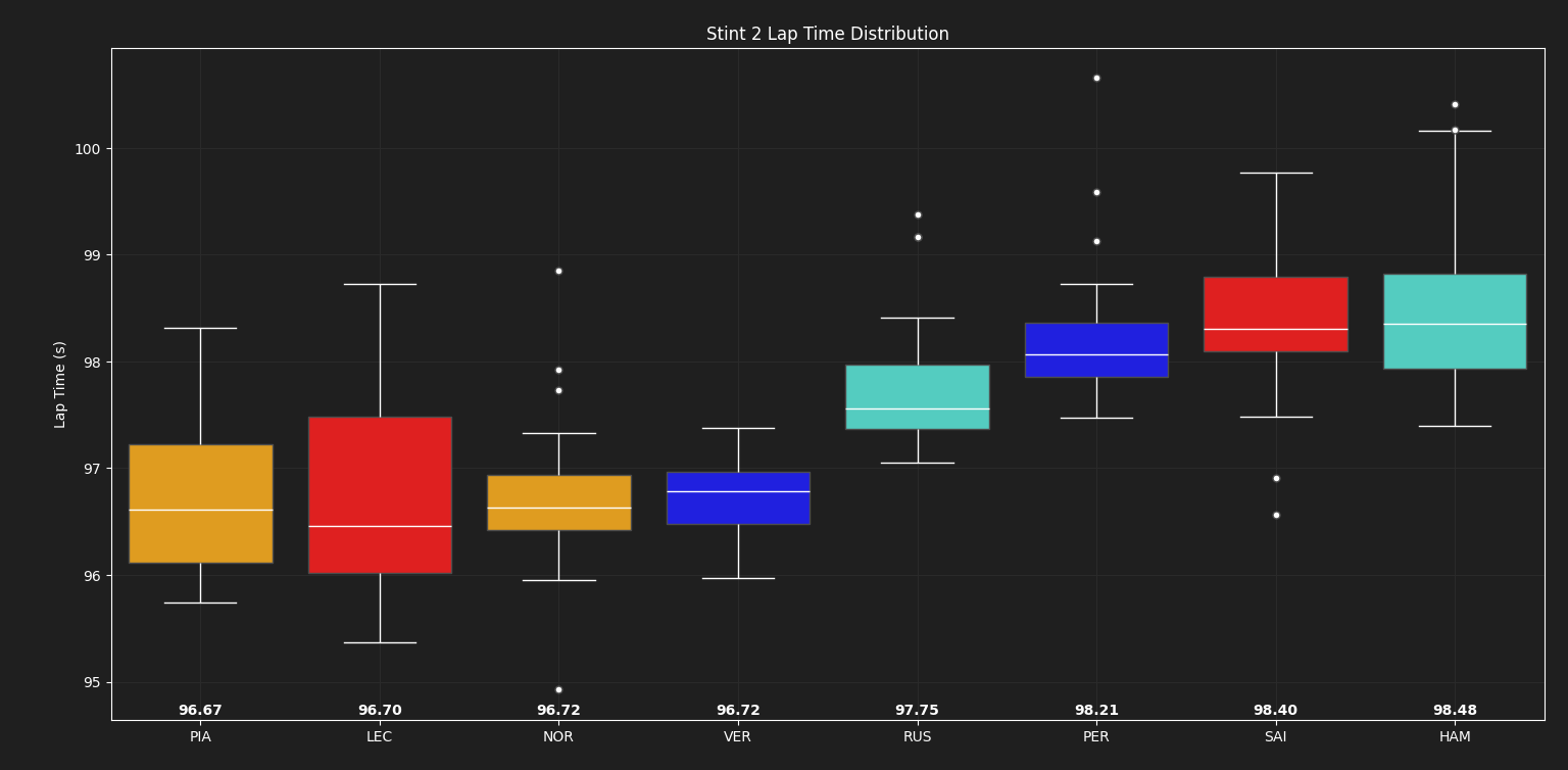 The most consistent was Norris, and this points to having a clear track ahead being very important in Singapore (so qualifying is very important). Just look at Leclerc, as the spread of lap times is very inconsistent and higher than driver #4, in fact the Monegasque driver in the first stint lost a lot of time behind Alonso.