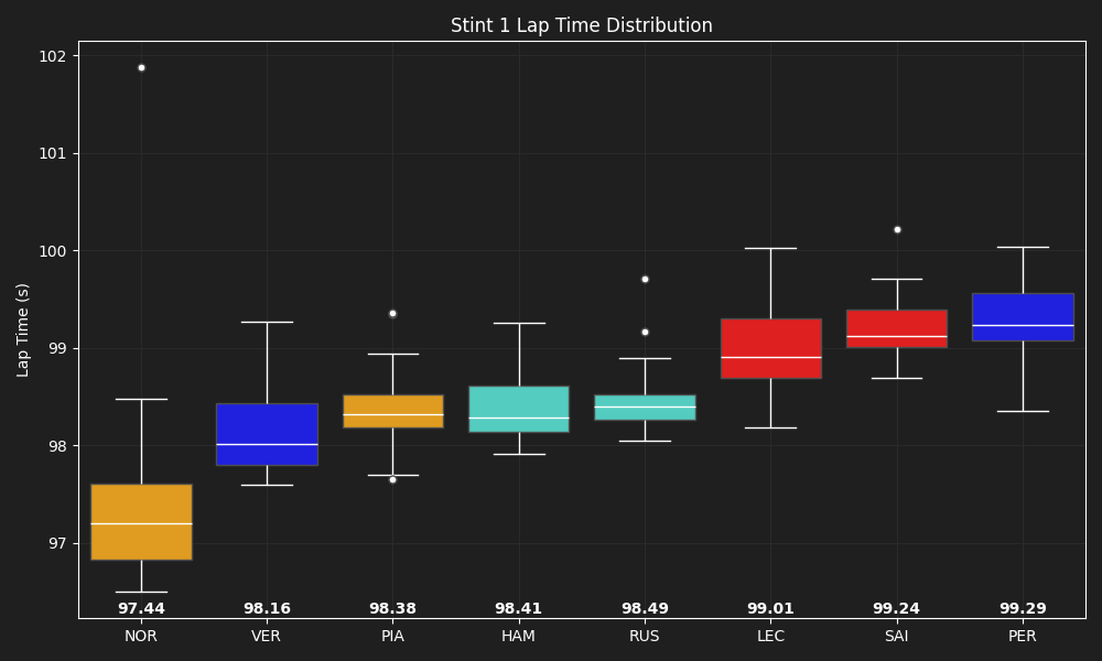 Norris is the fastest in the first stint and also the only one to go below 98 s/lap. Lando is faster than Verstappen by 0.72 s/lap, but less constant than the others, why?